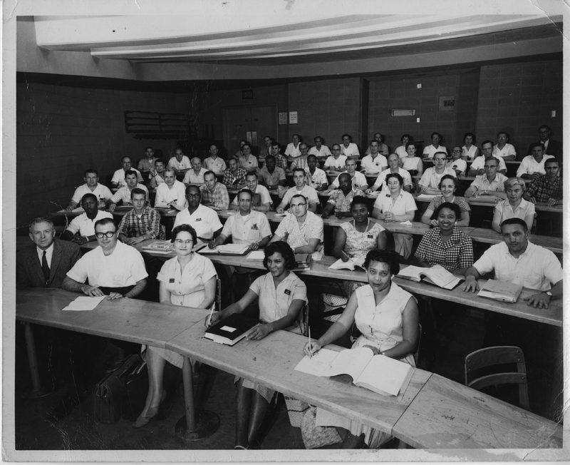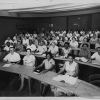 Photo of Lois Bronz in a classroom. Date on back: "8-6-59." Lois received her Bachelors from Xavier University (New Orleans< LA) and Masters in Education from Wayne State University (Detroit, MI).