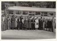 May Morgan Robinson and unidentified group in front of charter bus. Undated black and white photo of May Morgan Robinson and unidentified individuals in front of a charter bus.