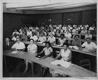 Photo of Lois Bronz in a classroom, 1959. Photo of Lois Bronz in a classroom. Date on back: "8-6-59." Lois received her Bachelors from Xavier University (New Orleans< LA) and Masters in Education from Wayne State University (Detroit, MI).